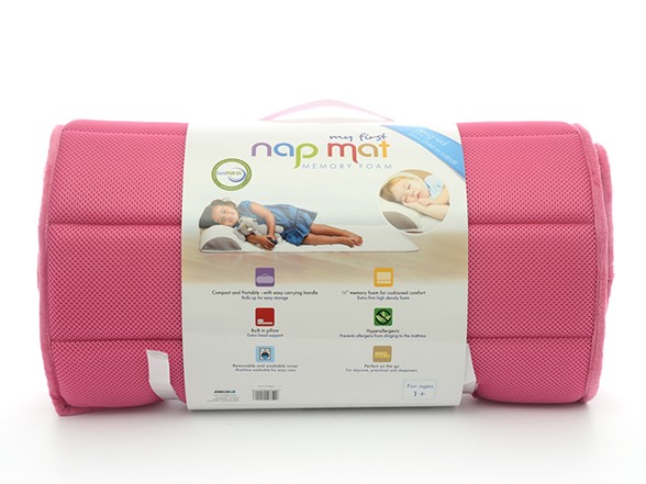 The My First Nap Mat is s a fun and easy carry mat that is comfortable, versatile and designed with your child in mind. This all-in-one pillow and mat is the perfect solution for daycare, preschool, all-day kindergarten, travel and any other environment where your little one needs some down time. For incredibly cushioned comfort on hard floors, the Nap Mat is constructed of 100% CertiPUR-US memory foam with cooling gel foam. Gel Memory Foam absorbs pressure and channels heat away, preventing excessive heat build-up that can cause sleep disturbances allowing your little one to truly be rested. Nap Mat dimensions when rolled out are: 41" H x 21" W x 1"H.