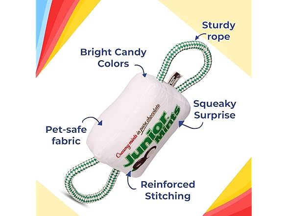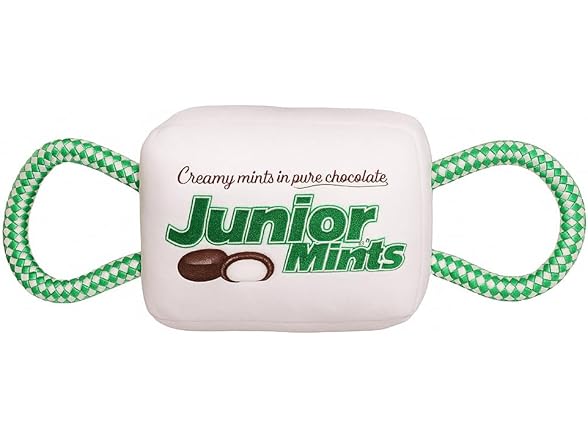 - TOOTSIE-INSPIRED ROPE PLUSH TOYS – Fun, wrapped candy plush toys featuring Tootsie Roll, Dots, Junior Mints, and Dubble Bubble designs, each with rope ends for tugging fun.