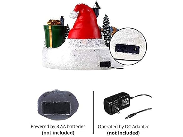 - SPECIFICATIONS – The merry elves dance around the Christmas tree to the sound of 8 different Christmas songs. The consistent lighting adds a beautiful glow to the village when turned on. Santa's little helper peeks out from his red Santa hat, overseeing the scene, as two other elves gather around a freshly-made snowman. This Snow Village is operated with 3 x AA Battery (Not Included) and has a DC Jack Input (DC Adapter Not Included). Product size: 12.20 x 9.1 x 9.5 IN.