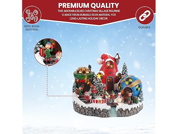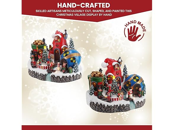 - RESIN - This Animated Elves Christmas Village is made from high-quality resin materials and is meticulously hand-crafted and hand-painted by skilled artisans. This Realistic Christmas Village Figure, an ideal complement to any Christmas Village Houses display, is built to last and will be a treasured part of your Christmas Decorations for years to come.