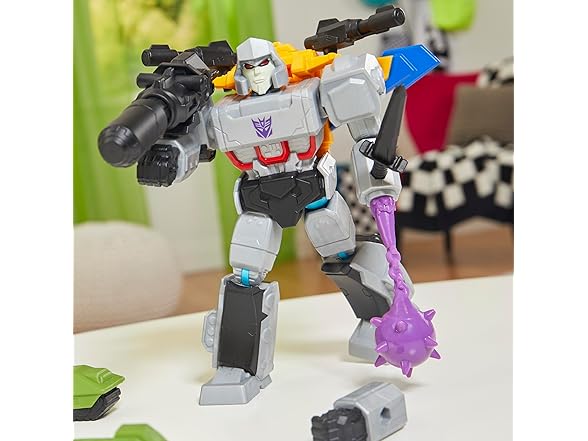 - INCLUDES 2 OPTIMUS PRIME PARTS: Transformers Megatron robot action figure comes with an orange-and-blue Optimus Prime jetpack and 2 black blasters, plus 4 accessories, including a bendy purple mace