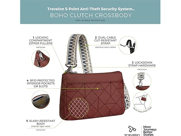 The Boho Anti-Theft Clutch Crossbody's feminine style, soft touch with colors and patterns all speak to inspired living. No matter how busy life gets, surrounding yourself with the little things makes a difference in living a more fulfilling life. Boho style delights the spirit while detailed craftsmanship, travel organization and built-in security have your carry needs covered. Now you can stop watching your bag and look up to see the world in front of you. Our built-in 5-Point Anti-Theft security system will protect your valuables from pickpockets and thieves. Includes slash-resistant mesh barrier in all 4 sides and bottom body panels; slash-resistant and lock-down strap; locking compartments; and RFID blocking organizer. Travelon packs your bag with peace of mind.