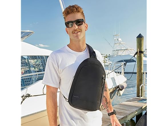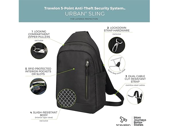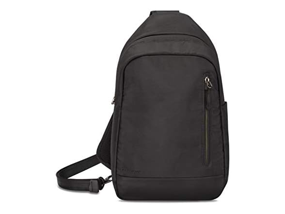 Navigate the city with this exceptional commuter and travel backpack. The Anti-Theft Urban Sling combines clean, modern design, 5-point Anti-Theft security system and thoughtful organization for all your tech. Constructed from durable polyester fabric with gun metal finish hardware, these bags will hold up to daily wear and protect your essential gear. Stop watching your bag and look up to see the world in front of you. Our built-in 5-Point Anti-Theft security system will protect your valuables from pickpockets and thieves. The Anti-Theft Urban Sling includes a slash-resistant mesh barrier in all 4 sides and bottom body panels; slash-resistant and lock-down strap; locking compartments; and RFID blocking organizer. Pack your bag with peace of mind, when you own a Travelon bag.