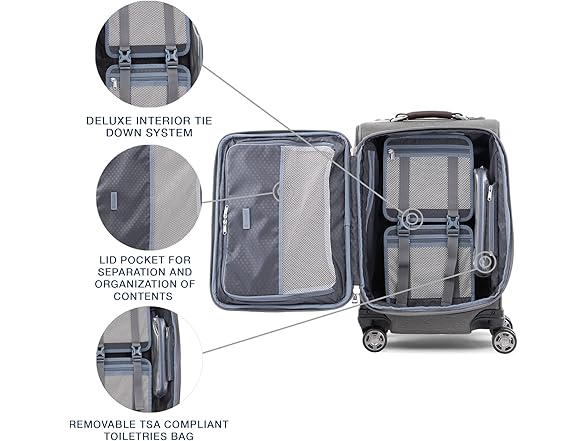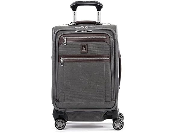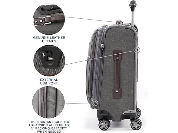 The carry-on spinner that suits you perfectly. The Platinum Elite 20" expandable business plus carry-on spinner delivers premium performance with sophisticated style in a carry-on size that is perfect for short to medium-length trips. The beautifully-appointed interior features a tie-down system with easy-access, built-in accessory pockets along with a removable, quart-size wet pocket that is TSA compliant and perfect for toiletries. Outside, leather details and chrome zippers add polish, while intelligent features, like the precision glide system with magnatrac self-aligning 360-degree dual spinner wheels and an adjustable PowerScope extension handle with Contour grip, deliver effortless roll and comfortable maneuverability. pockets and TSA-compliant removable, quart-sized wet pocket. This Fit to Fly carry-on spinner has been sizer been tested to accommodate overhead bin space on most major US airlines. Fully expanded Carry-On may not meet airline restrictions.