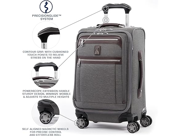 - EFFORTLESS MOBILITY: Patented Precision Glide System with magnetic self-aligning 360° dual spinner wheels, 4-stop PowerScope extension handle and non slip Contour Grip ensures stress free maneuverability. Top, side and bottom carry handles