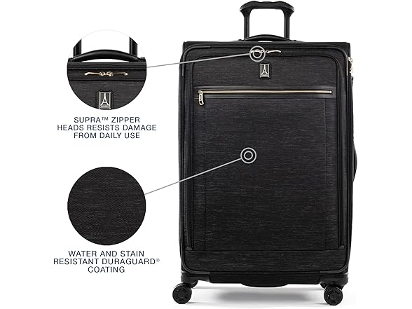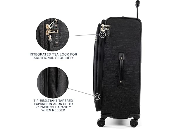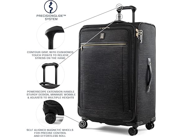 Big is beautiful with the platinum elite 29” expandable spinner. The largest spinner in the platinum elite line, this top-of-the-line suitcase is built for durability with premium design details, including scuff-resistant, stain-resistant fabric, Leather accents and chrome zippers. Ideal for long trips or multiple people, This bag helps prevent wrinkles with a fold-out suiter, while keeping everything in its place with a deluxe interior tie-down system and integrated accessory pockets. A tip-resistant tapered expansion delivers up to 2” more packing capacity and an integrated, TSA-compliant lock keeps contents secure while allowing authorities to unlock and lock the suitcase without damage when needed for checked-bag inspection. Mobility is effortless with the precisionglide system, which includes eight magnatrac self-aligning 360-degree spinner wheels guided by an adjustable PowerScope extension handle with patented Contour grip, ergonomically designed for a comfortable handhold and accented with soft, rubberized touch points.