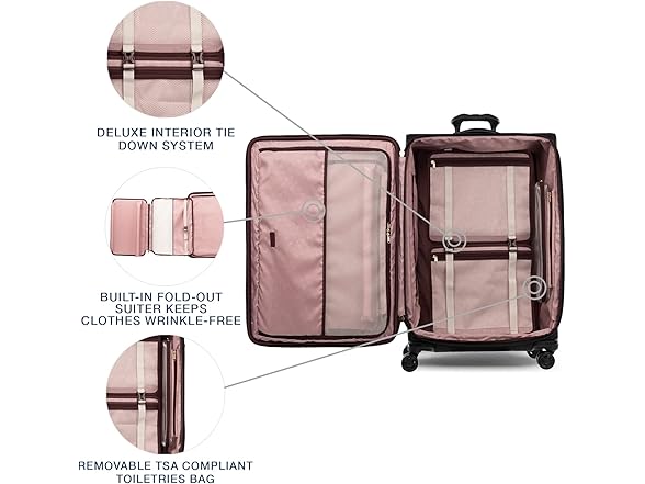 - WRINKLE FREE, ORGANIZED TRAVEL: Built-in suiter keeps clothes wrinkle free. Interior tie down system with accessory pockets and removable wet pocket help keep contents organized. Top, side and bottom carry handles provide carrying options.