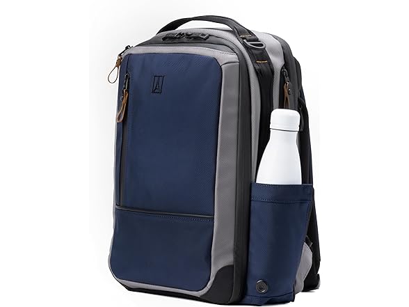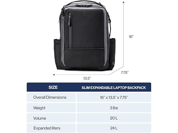 Sacrifice nothing but bulk with the Travelpro Altitude Slim Expandable Laptop Backpack 20-24L. Designed by pros for the modern pro, this sleek backpack is loaded with features to keep you and your gear organized on the move. Whether you're crushing your daily commute or heading out for a weekend adventure, this bag keeps your essentials close and your style on point. Seriously tough but eco-friendly, the high-density ballistic ECOFAB exterior with DuraGuard coating shrugs off stains and scrapes, while the ECOFAB interior lining with H2O guard keeps things clean and green. Need more room? Just unzip the expansion for an instant 20% boost in space. Protect and organize your gear like a boss with multiple compartments, a built-in key leash, padded sleeves for your laptop and tablet, and a Travelpro ID TheftBlock pocket for your cards and passport. Plus, the dedicated pocket for your tracking device and discreet anti-theft pockets add extra layers of security. The Travelpro QuickSlip pocket with magnetic closure is a game-changer for easy cellphone access, and dual side pockets stash water bottles, umbrellas, and other grab-and-go essentials. Full-grain leather touch points, airline-grade aluminum hardware, and hardy, water-resistant and traditional YKK® zippers add serious style and toughness. The padded airflow back panel and adjustable shoulder straps keep you comfy all day long or use the rear stacking strap to secure the backpack to a rolling bag when you need to go hands-free.