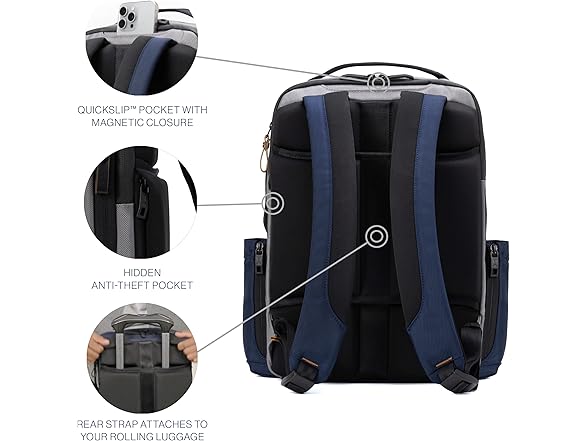 - BUILT FOR COMFORT & CONVENIENCE: Airflow back panel and adjustable shoulder straps are padded for all-day comfort. Rear stacking strap secures the backpack to your rolling luggage.