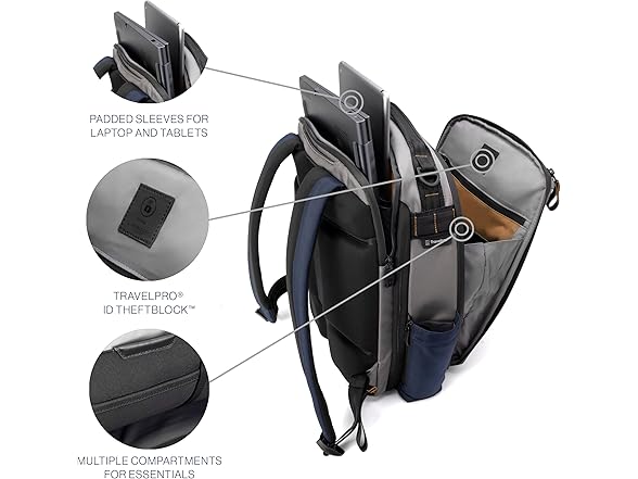 - ORGANIZED STORAGE & TECH PROTECTION: Multiple compartments and a handy key leash keep essentials in check. Travelpro ID TheftBlock pocket, dedicated pocket for a tracking device, and discreet anti-theft pockets. Separate padded sleeves cushion your tablet and laptops up to 16”. Travelpro QuickSlip pocket with magnetic closure is secure but easy to access cellphone.