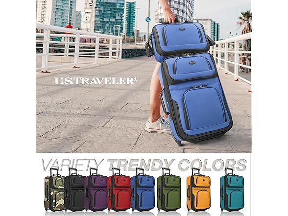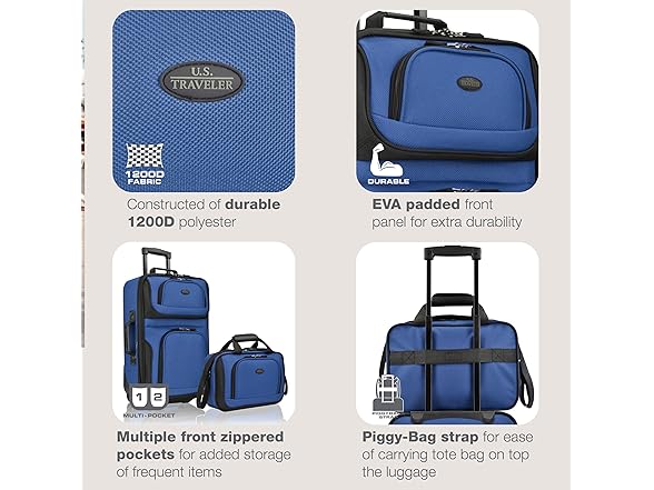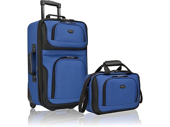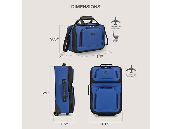 Go anywhere with the Rio 2-Piece Expandable Carry-On Luggage Set by U.S. Traveler. This luggage set is made of luxurious superior 1200 Denier rigid polyester. The thick EVA padding protects your belongings. The suitcase features an internal retractable push-button with self-locking mechanism and inline skate wheels with corner protectors. It has two large zippered pockets and amble interior for you to pack all your travel essentials. Need more room? The expandable feature provides 25% more packing capacity. Full interior lining and dual adjustable tie-down straps to secure your belongings. Top and side carry handles make lifting luggage easy. Product Dimensions: 21-inch upright: 21"H x 13.5"W x 8.5"D Expands to 10.5"D; 6.6 lbs.; travel tote: 14"W x 10"H x 6"D :1.3 lbs.