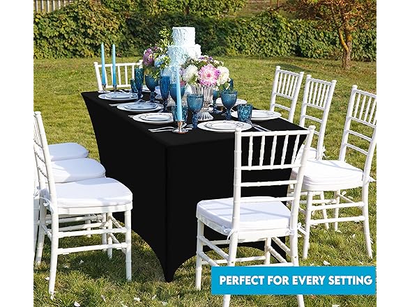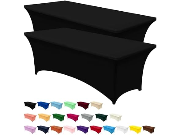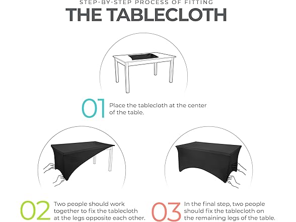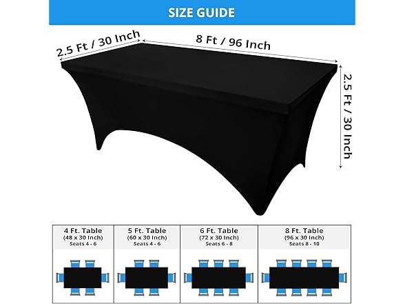 - DESIGN: The 8-foot tablecloth always fits and fits perfectly. The 2-way stretch spandex table cover is designed with reinforced leg pockets for the table legs to give it a tight and professional look, and your table cover won't slip or expand again because of this special design. The 8-foot tablecloth fits a table measuring 96L x 30W x 30H Inch