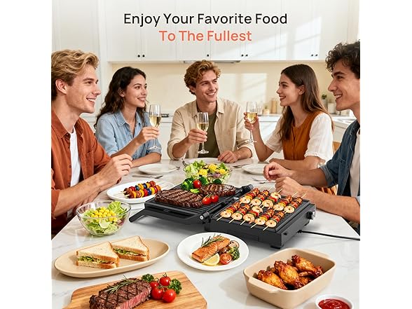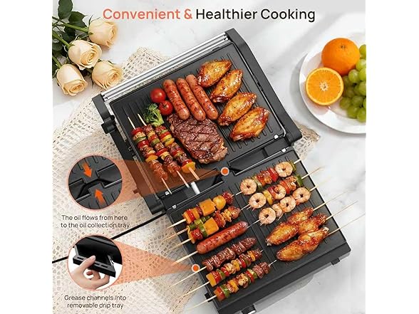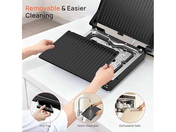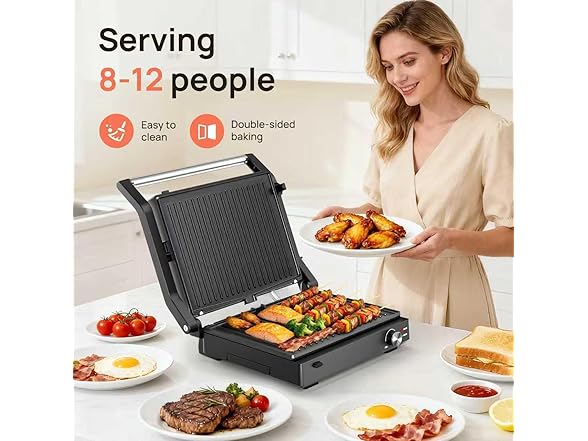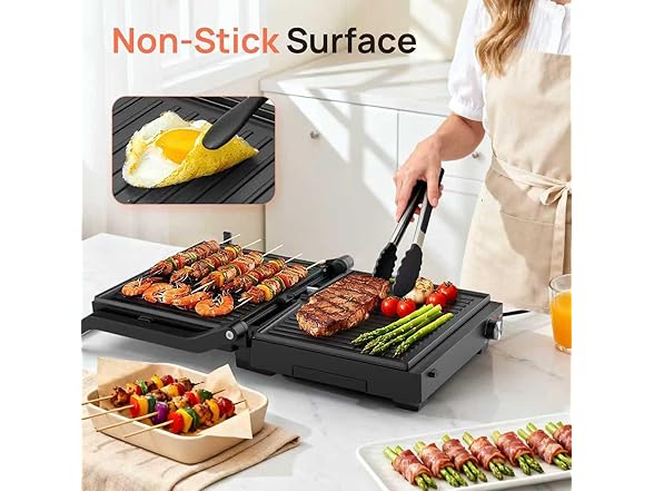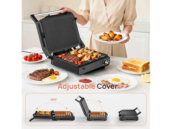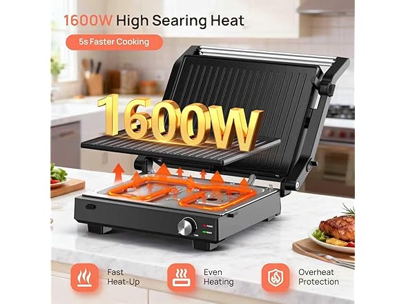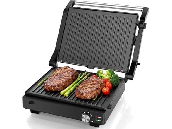 Electric Indoor Grill, 14'' Panini Press Grill, 1600W Electric Grill for Steak, Burger, Sandwich, 450℉ Dual Cooking Plates, 180° Flat Griddle, Removable Non-stick Grill & Drip Tray, Dishwasher Safe