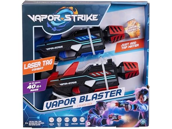- SET OF 2 VAPOR BLASTERS. Get into the battle! Also includes a water dropper to fill the tank with water. All vapor strike blasters work together. Batteries not included. Ages 6+.