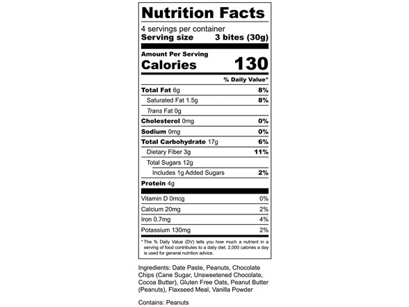 - Real, Simple Ingredients: Our clean, balanced ingredients sustain blood sugar levels and leave you feeling great all day. Ingredients are Date Paste, Peanuts, Vegan Chocolate Chips, Gluten Free Oats, Peanut Butter, Flaxseed Meal, Vanilla.