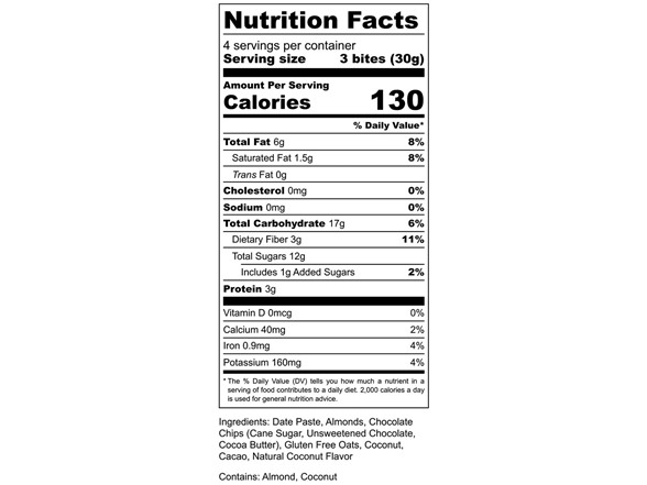 - Real, Simple Ingredients: Our clean, balanced ingredients sustain blood sugar levels and leave you feeling great all day. Ingredients are Date Paste, Almonds, Vegan Chocolate Chips, Gluten Free Oats, Coconut, Cacao, Natural Coconut Flavor.