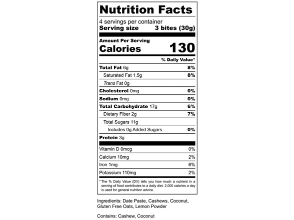 - Real, Simple Ingredients: Our clean, balanced ingredients sustain blood sugar levels and leave you feeling great all day. Ingredients are Date Paste, Cashews, Coconut, Gluten Free Oats, Natural Lemon Flavor.