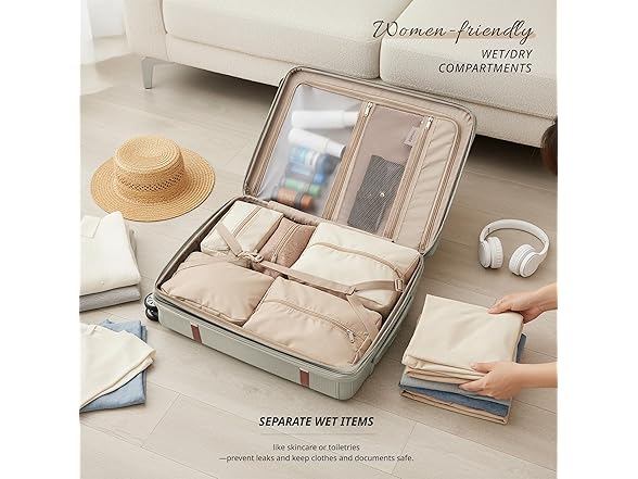 - Organization & Expandable:Designed with women travelers in mind, this carry-on features multiple compartments and a dedicated wet/dry pocket to keep skincare, swimwear, or damp clothes separate from delicate items. The expandable suitcase design adds room for your favorite shoes, performance outfits, or travel finds
