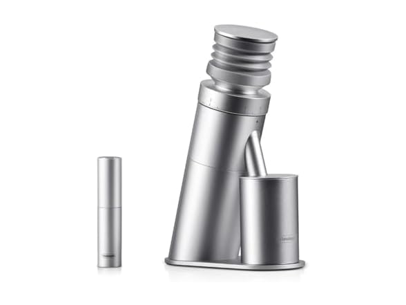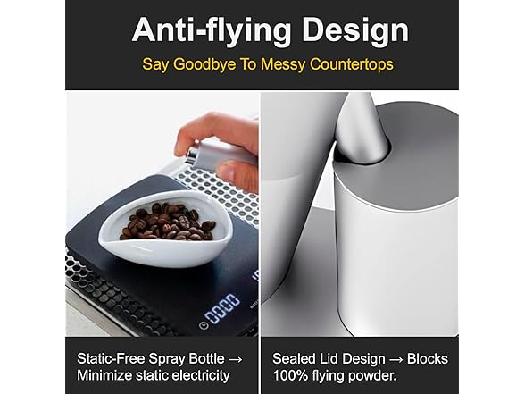 - ANTI-FLYING POWDER DESIGN: This coffee grinder espresso features a sealed-lid powder catching cup that completely prevents powder spillage. And we are equipped with an anti-static spray with coffee bean grinder, a few sprays on the coffee beans before grinding, can more minimize static electricity. Additionally, the burr coffee grinder's innovative blow-out funnel design significantly reduces chaff mess, keeping your brewing area clean.