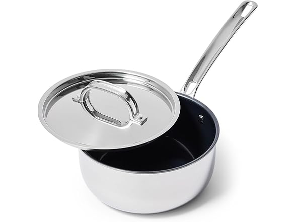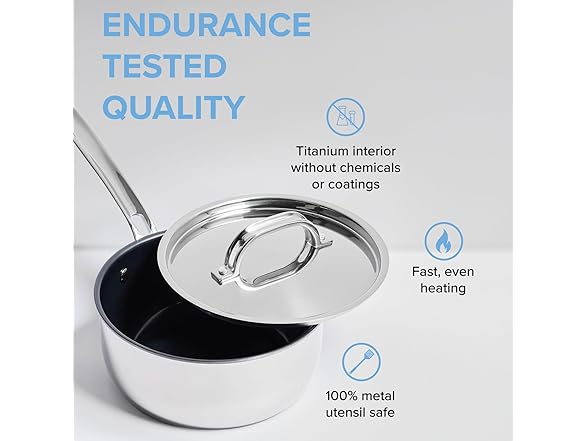- 3 QUART SAUCE PAN: Ideal for both novice chefs and seasoned chefs, this saucepan includes a metal lid and is perfect for cooking soups, broths, and pasta sauces with precise heat control. Crafted with a sleek laser clad titanium construction, this small sauce pot is built for optimal heat retention, is ideal for deglazing, and will not react with acidic or alkaline foods, and can be preseasoned for a non-stick like performance