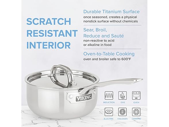 Create culinary masterpieces and elevate your kitchen with the Viking 4-Ply Laser Clad Titanium 3 Qt Sauce Pan. Great for both beginner and veteran chefs, this saucepan is perfect for cooking soup, broth, sauces, and its exceptional heat retention provides consistent and even cooking results, allowing you to sear, broil, reduce and saute like a pro. Our cooktop sauce pan features a durable 4 ply construction consisting of a laser clad titanium interior, aluminum core, and a stainless steel exterior, and the sleek blue and silver finish provides an excellent complement to contemporary kitchen decors. Our saucepans feature a comfortable ergonomic handle with a heat break to keep it cool while you cook. Our sauce pots are easy to hand wash with hot water, are compatible with all cooking surfaces including gas, electric, and induction, and are safe up to 600 degrees F (315 degrees C). Our sauce pots are backed by a limited lifetime warranty.