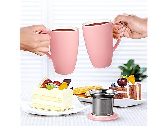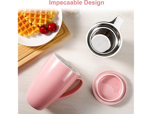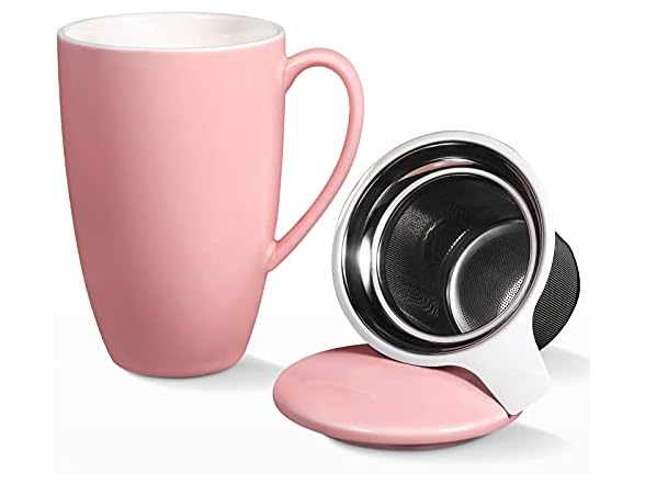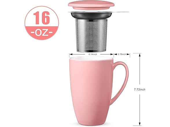Tea Cup with Removable Infuser and Lid, 16 Oz Microwave Safe Ceramic Tea Cup for Loose Leaf, Coffee, Cocoa and Milk, Gift for Tea Lovers, Light Pink