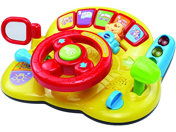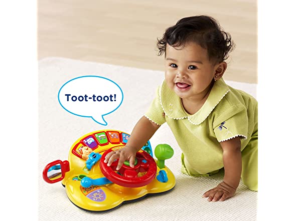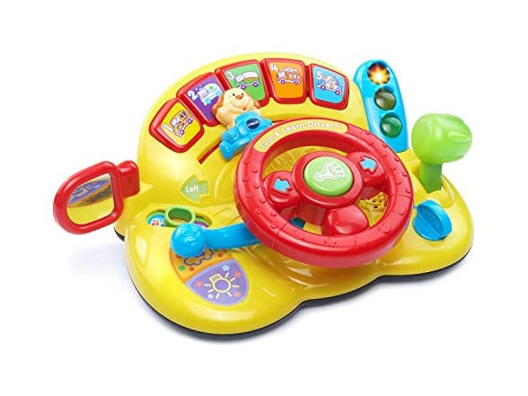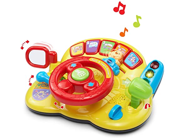 - Your little one will love pretending to drive using the steering wheel toy that causes the cute dog character to move back and forth