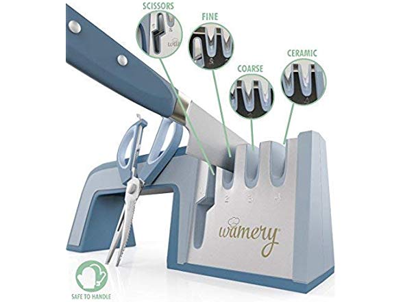 - SAFE: The kitchen scissors best seller sharpening and knive sharpener has an easy design to fit into any kitchen drawer and blend with your cooking utensils. This manual sharpener comes with non slip pads that provide control for a safe job. A kitchen utensil for everyone, from chefs to seniors.