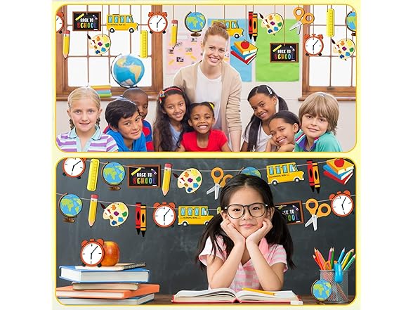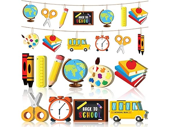 These preschool classroom decorations adopt blackboard, alarm clock, book, and car patterns, they are full of school elements, look cute and elegant, applying them to decorate school, can add happy and warm vibe.
