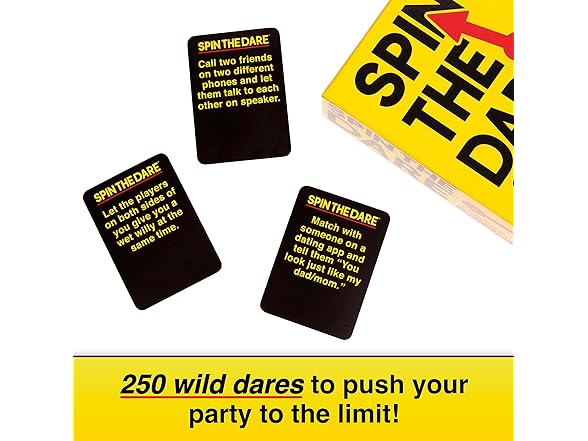 - What's Inside: Spin The Dare includes 250 dare cards, a spinner, and game instructions, ensuring you have everything you need for a memorable night of fun.