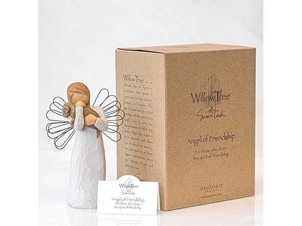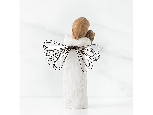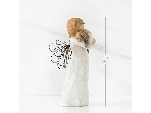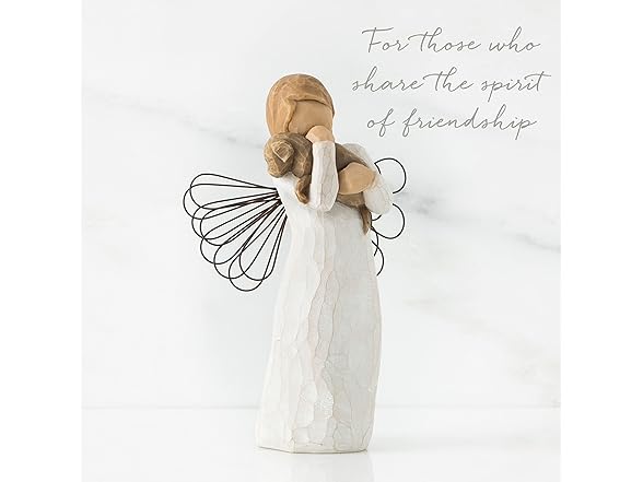 For those who share the spirit of friendship GIFT-GIVING SUGGESTIONS: A gift to celebrate friendships. Especially nice for pet lovers! Willow Tree angels resonate with many cultures and ages of people. To some they represent protection, to some they are an outward reminder of inner peace, and to some they represent a way to remember those who have left this earth. Hand-carved figures reveal their expression through body gestures only... a tilt of the head, placement of the hands, a turn of the body. Since 1999, American artist Susan Lordi has worked in partnership with DEMDACO to produce, market and distribute Willow Tree , her line of carved figurative sculpture. From her studio in Kansas City, Lordi hand carves the original of each figure. This piece is cast from Lordi's original and painted by hand. Enclosed inside each fitted packaging box is a gift-giving card with piece title and sentiment on it. Each piece is intended to be open to interpretation from the viewer. "Willow Tree isn't so much about the tangible piece. It represents an emotion or it marks a memory." -Susan Lordi Ready to display on a shelf, table or mantel. To clean, dust with soft brush or cloth. Avoid water or cleaning solvents.