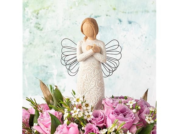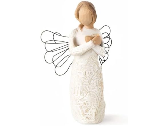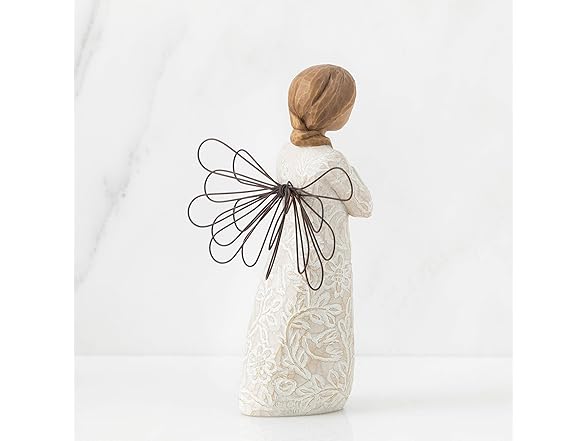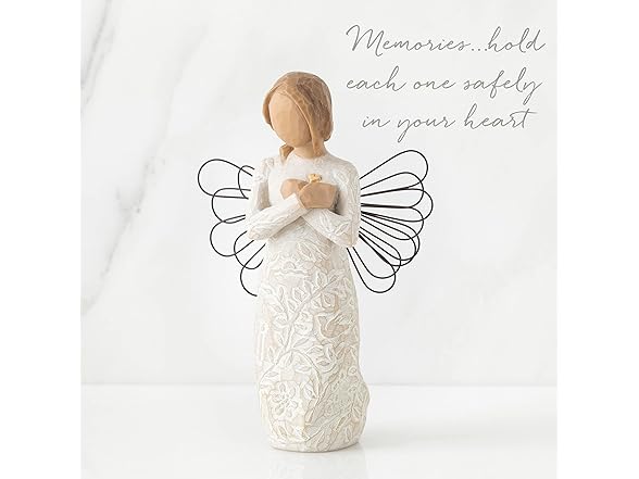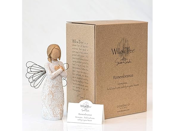 TITLE: Remembrance SENTIMENT: Memories… hold each one safely in your heart GIFT-GIVING SUGGESTIONS: A gift to express sympathy, comfort, remembrance and healing. Willow Tree angels resonate with many cultures and ages of people. To some they represent protection, to some they are an outward reminder of inner peace, and to some they represent a way to remember those who have left this earth. Hand-carved figures reveal their expression through body gestures only... a tilt of the head, placement of the hands, a turn of the body. Since 1999, American artist Susan Lordi has worked in partnership with DEMDACO to produce, market and distribute Willow Tree , her line of carved figurative sculpture. From her studio in Kansas City, Lordi hand carves the original of each figure. This piece is cast from Lordi's original and painted by hand. Enclosed inside each fitted packaging box is a gift-giving card with piece title and sentiment on it. Each piece is intended to be open to interpretation from the viewer. "Willow Tree isn't so much about the tangible piece. It represents an emotion or it marks a memory." -Susan Lordi Ready to display on a shelf, table or mantel. To clean, dust with soft brush or cloth. Avoid water or cleaning solvents.