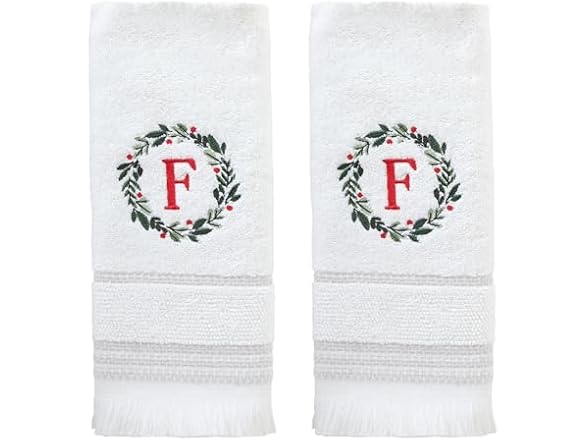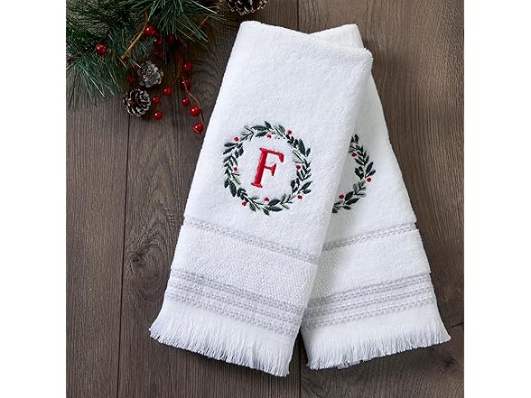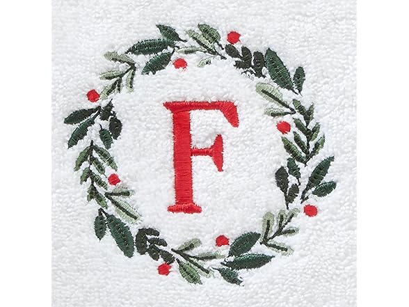 SKL Home Christmas/Winter Wreath Monogram Hand Towel F 2pc Set for Bath/Kitchen/Bar & Gift, White