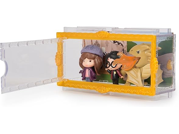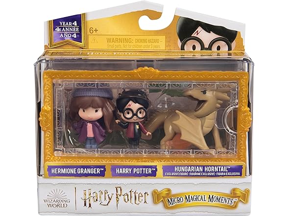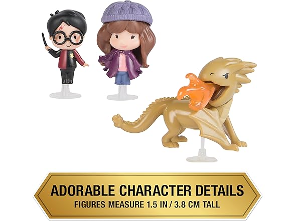 - 3 HARRY POTTER FIGURES: Discover 1.5-inch figures of Harry Potter, Hermione Granger & a Hungarian Horntail, a clear display case and 3 stands. Year 4 movie details make these tiny Harry Potter toys a must-have