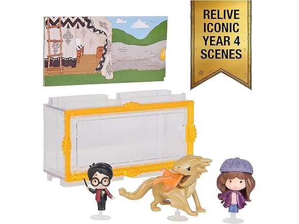 Relive memorable Year 4 movie moments from Harry Potter and the Goblet of Fire with the Micro Magical Moments figure sets. This multipack includes 1.5-inch figures of Harry Potter, Hermione Granger and a Hungarian Horntail dragon, a clear portrait frame display case with a double-sided backdrop, and three figure stands. Unbox your characters and discover each toy’s adorable details: Harry’s Triwizard Tournament outfit, Hermione in her hat and scarf, and the sculpted tail and wings on the Hungarian Horntail. The display case’s backdrop depicts the Triwizard Tournament’s First Task: retrieving the golden egg being guarded by the dragon, a detail Harry Potter fans and collectors will love. Display the characters on their stands, in the case or stand them up on their own. For more spellbinding display possibilities, the set’s case stacks and connects with the other Micro Magical Moments sets and figures (each sold separately). Collect them all to build your own displays and Harry Potter scenes. Harry Potter toys are must-have gifts for girls, boys and fans who enjoy miniature toys, collectibles, wands, action figures, dolls, and doll accessories. Bring home the Micro Magical Moments figure set and expand your wizarding world collection.
