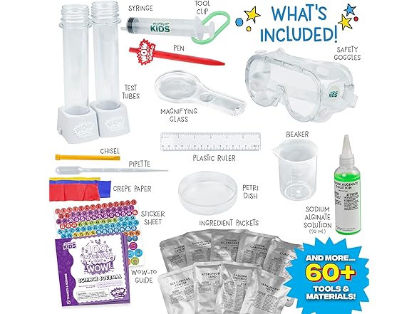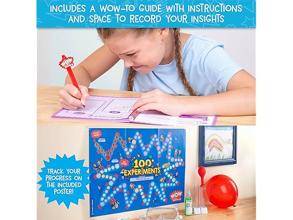 - INTERACTIVE MANUAL FOR EXTENDED LEARNING: The kit’s 96-page illustrated “Wow-To Guide” not only takes kids through each of the 100 experiments, it also doubles as a write-in science journal with prompts to keep kids thinking and space to record their observations.